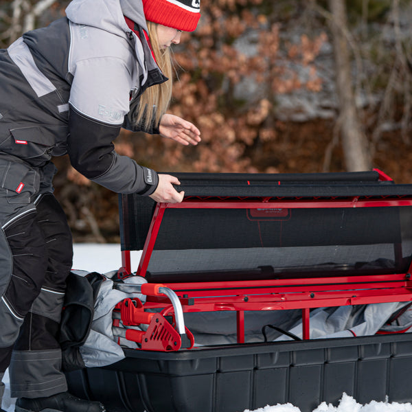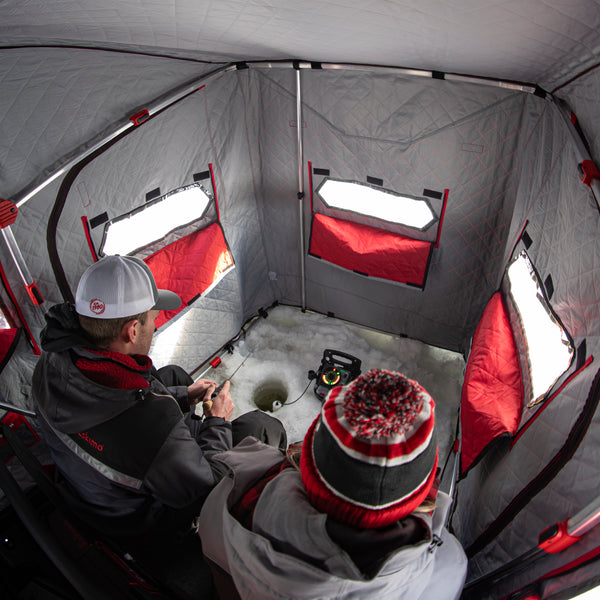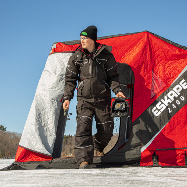 The Eskape™ 2400 has the features and benefits you want in a side-door shelter, without the hassle of difficult setup. Designed specifically for side door entry, pole setup to accommodate the door is a convenient snap with the Eskape. No more tripping over your electronics, or stepping in your hole when climbing in or out of the shelter. A comfortable bench seat provides flexibility for seating capacity, and folds up and down for sled access. Fully-insulated, with 25.5 square feet of fishable area and spacious headroom, this is a comfortably large 2-person flip shelter, but still fits under a tonneau cover in the back of most crew cab pickups.